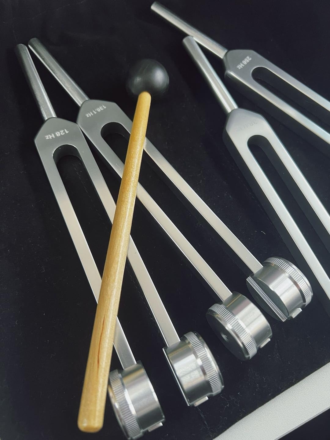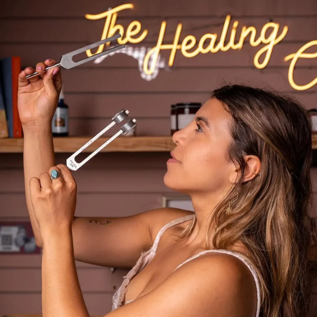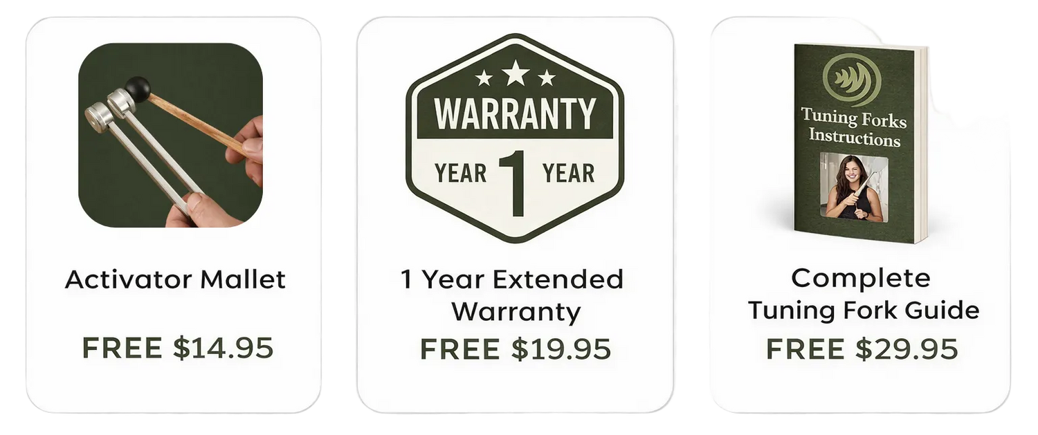 Our Harmony Set is perfect for beginners! It includes both weighted forks (128Hz and 136.1Hz) for physical relief and unweighted forks (256Hz and 384Hz) for mental clarity. The 128Hz is especially versatile - you'll feel immediate vibration and relaxation. Plus, our free guide walks you through everything step-by-step.