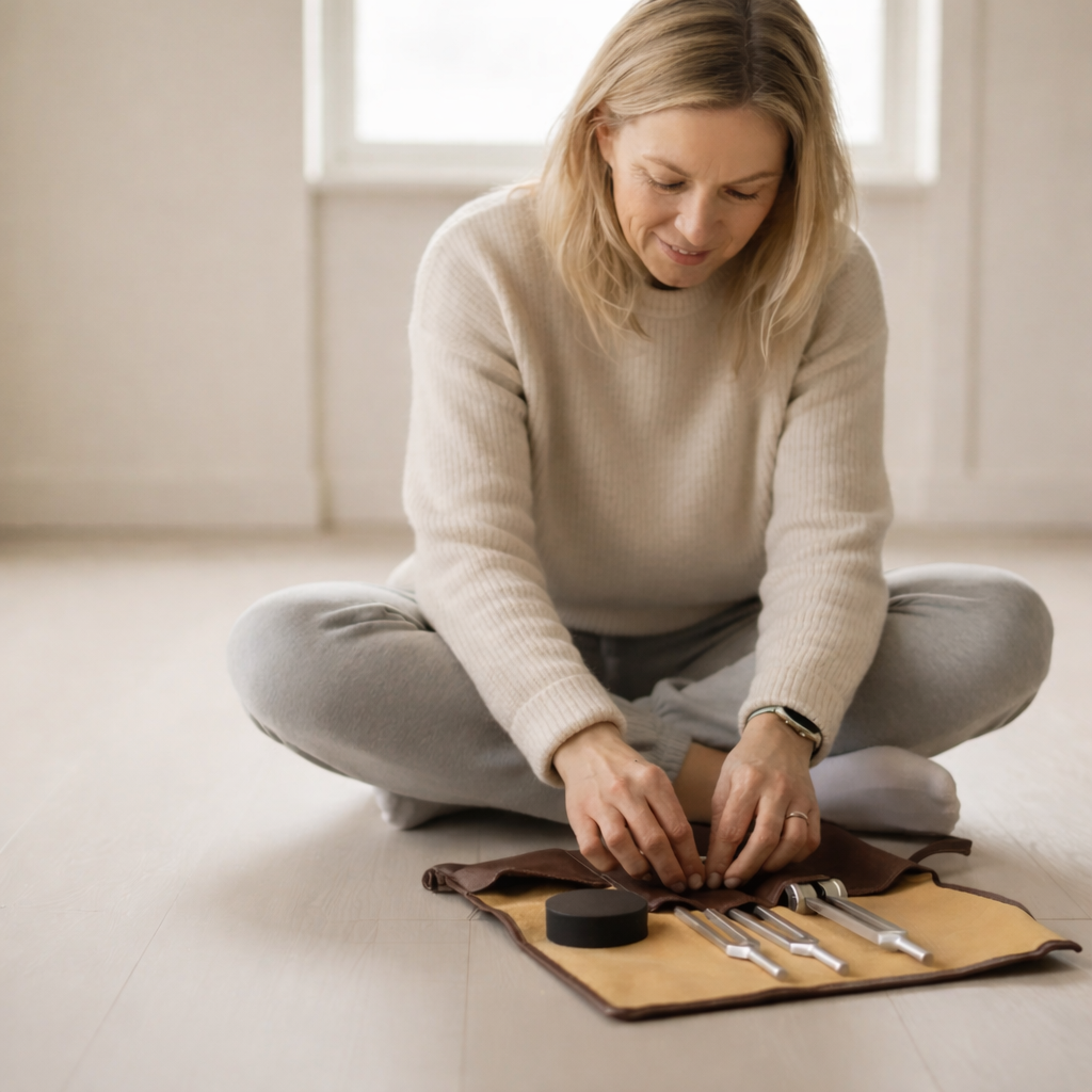 Tuning forks are very safe. Avoid placing them directly over pacemakers, insulin pumps, or recent surgical sites. Some people experience temporary lightheadedness or emotional release as tension releases - this is normal and passes quickly. Stay hydrated and start slowly.